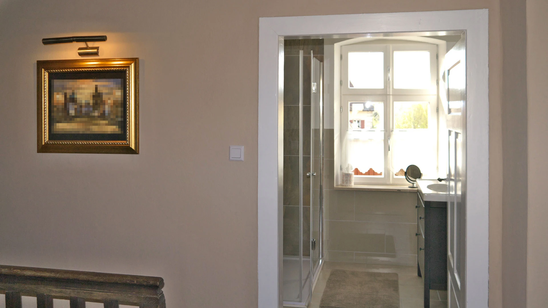 Im zweiten Obergeschoss können vier Personen in zwei Doppelbetten – ein Schlafzimmer und eine Schlafgalerie (Durchgangszimmer) – schlummern. Bettwäsche ist ausreichend vorhanden und von hier oben haben sie einen schönen Ausblick auf die Hohenzollernfestung Wülzburg und über die Dächer der Altstadt von Weißenburg.