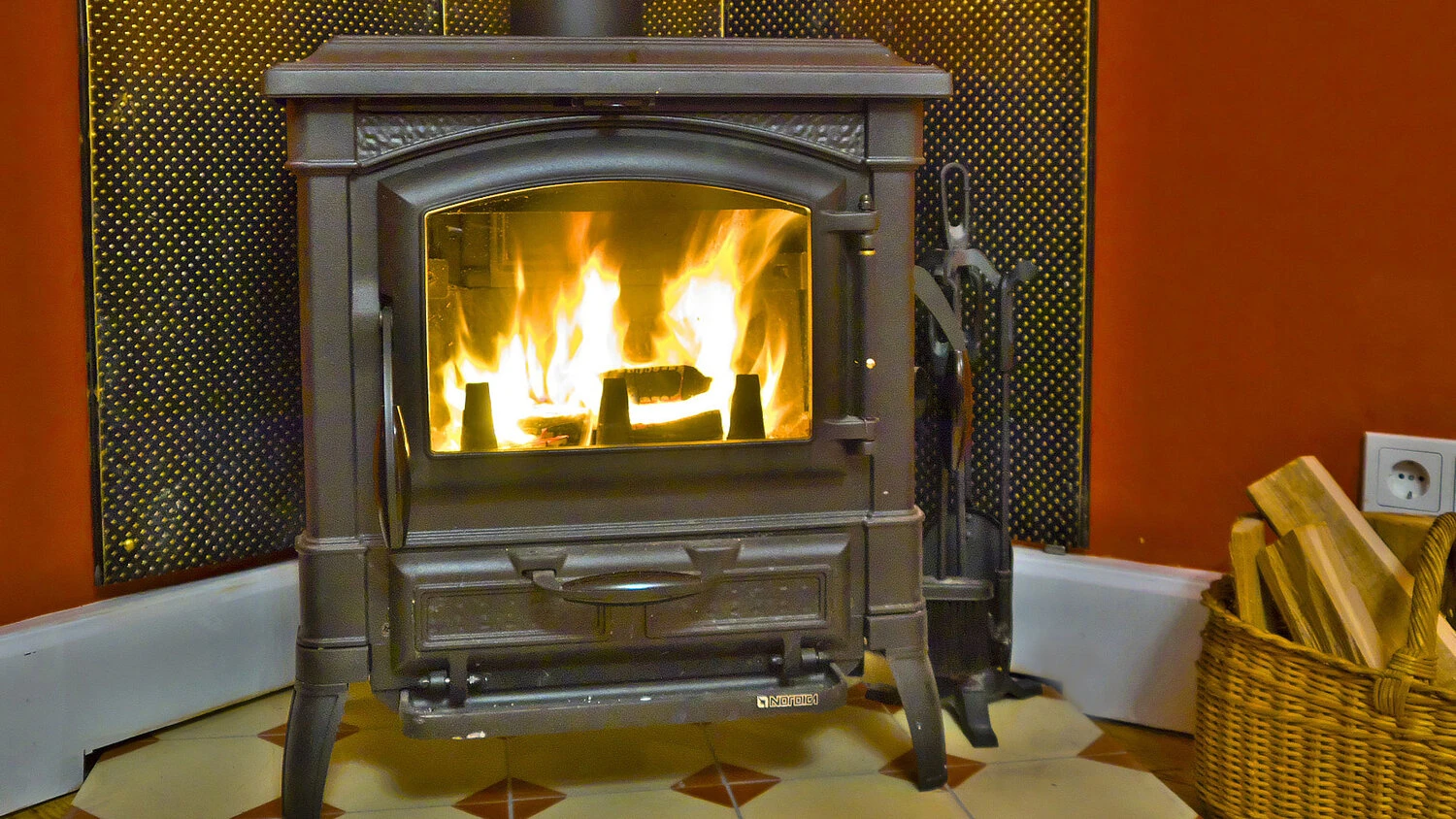 Wohnbereich: SAT-TV-, LED-Fernseher, DVD-Player, Holzofen, Couch und drei Sessel.